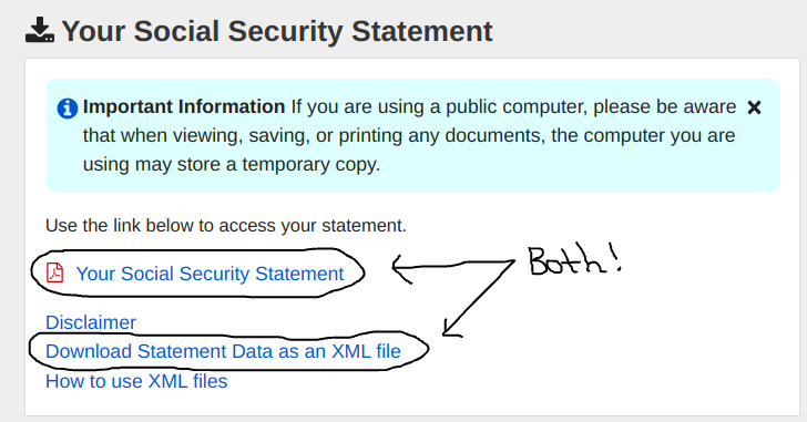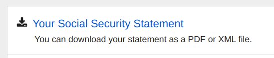 2) Click the 'Download Your Statement Data as an XML file' link to download your XML data. This link appears near the top of the page after you sign in to SSA.gov. Click on these links to download your pdf statement and the accompanying .xml wage history file.